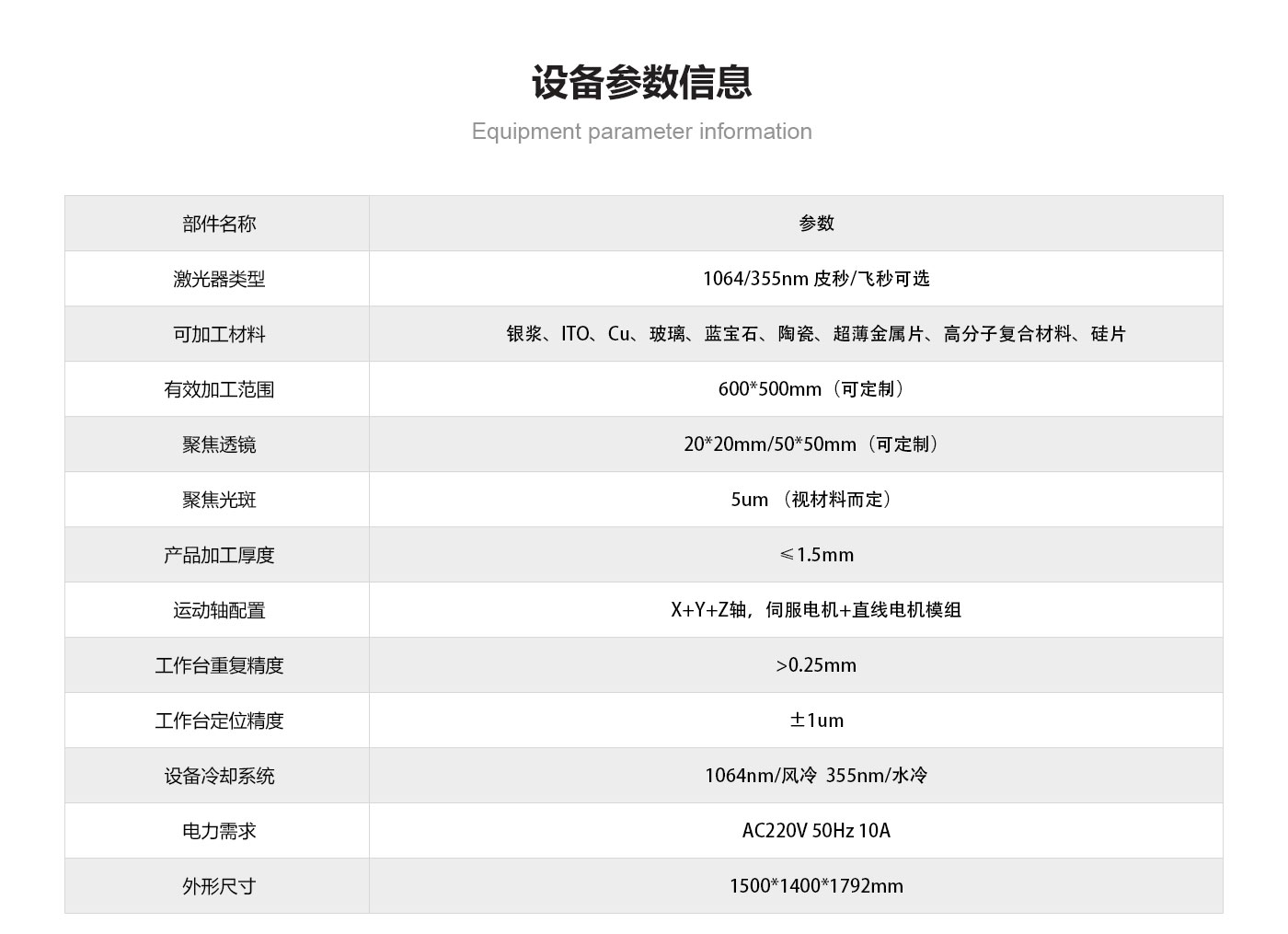 ? 設備最大加工范圍600*500mm,XY平臺精度≤2um。